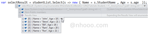 Age = s.Age });在上面的示例中,selectResult將包含具有Name和Age屬性的匿名對(duì)象,如下面的調(diào)試視圖所示。